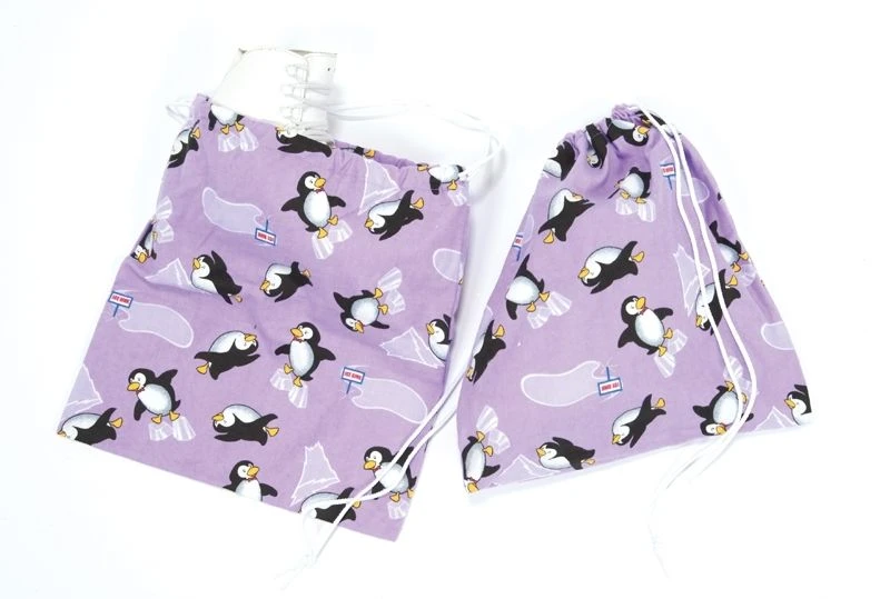 - Purple or Blue Penguin Print 100% soft cotton bags with drawstrings.