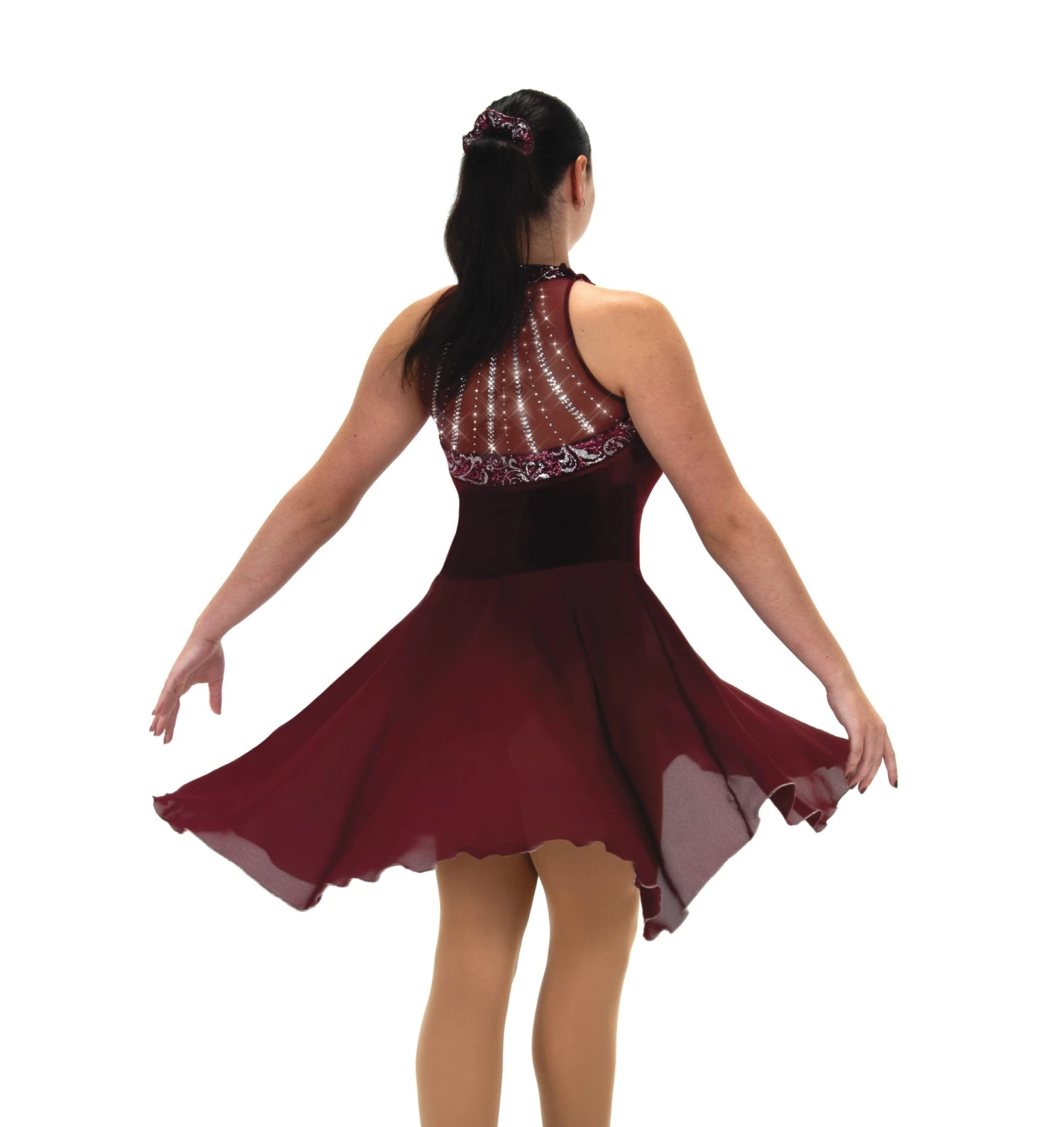 - A deep wine red velvet dress with a glitter trimmed sweetheart neckline and mesh back with strands of sparkling crystals