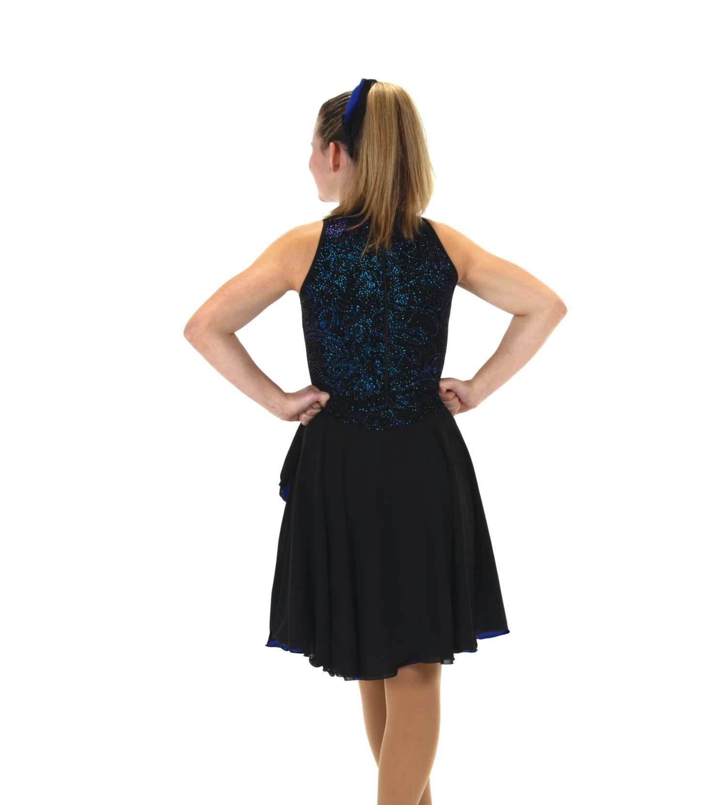 - A high neck, flattering angled and wrapped skirt that shows a hint of blue in the underskirt and a back zipper makes this a bra-friendly design