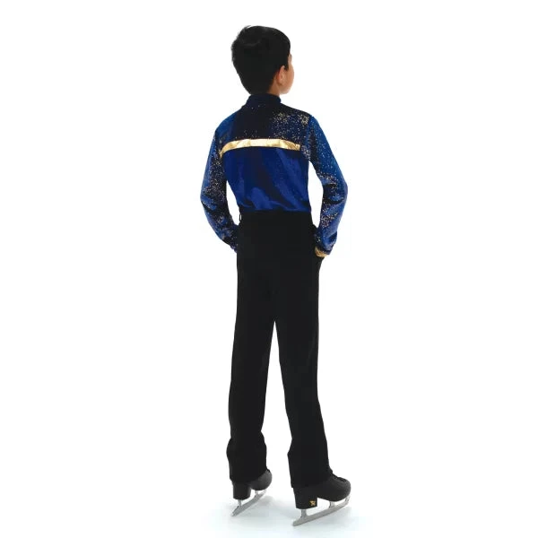 - Royal blue velvet top with a high neck and gold trim accenting the chest