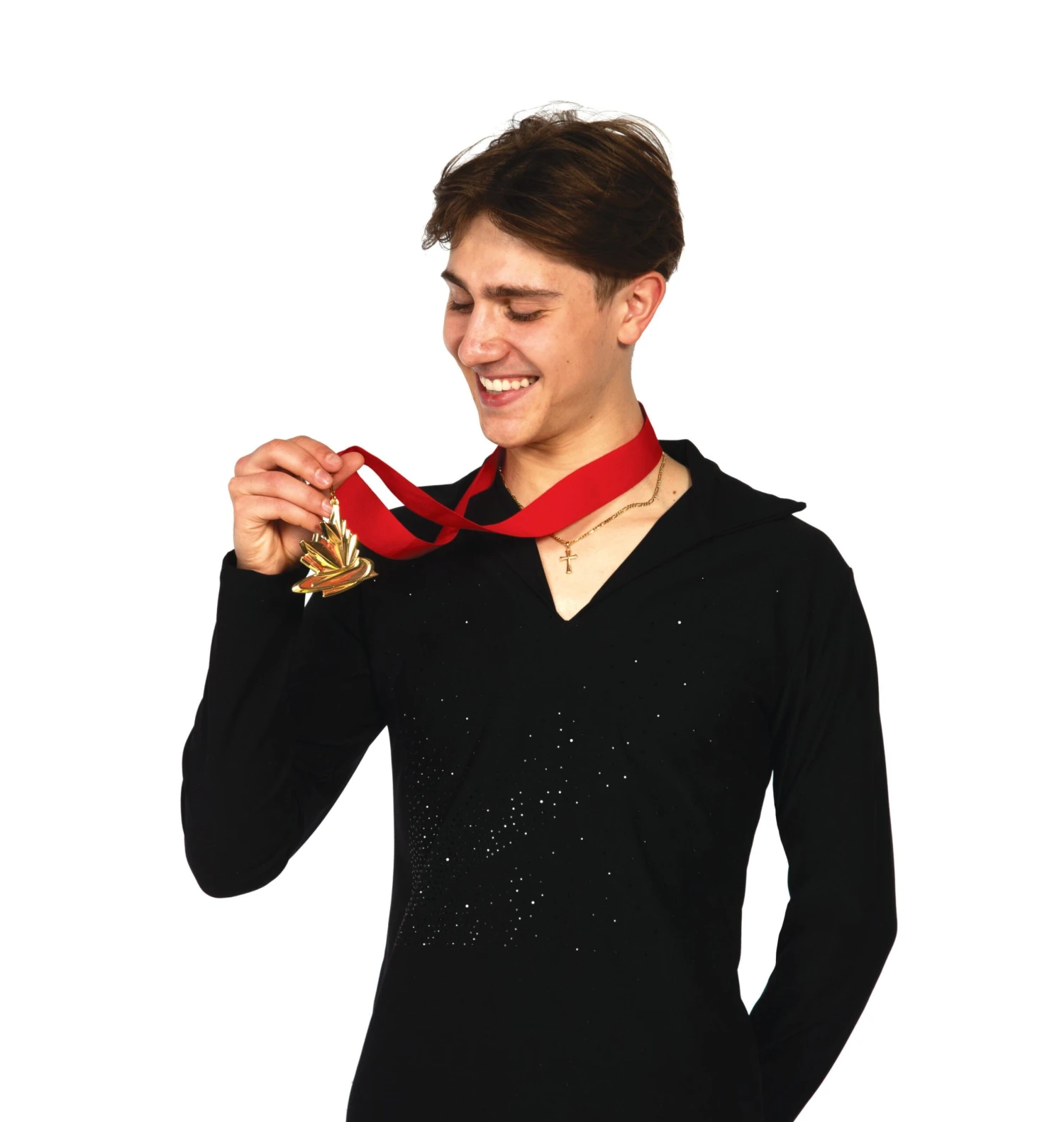 - Perfectly understated black matte supplex shirt has subtle black crystals fanning out across its front which catch the light with every move