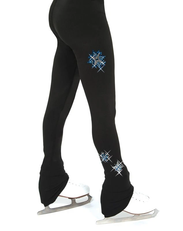 - Cozy black fleece leggings with sparkling crystal snowflakes on one leg